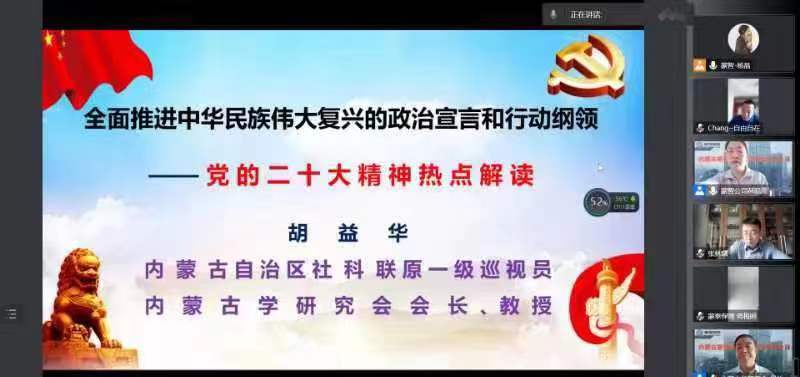 本次培训邀请内蒙古自治区社科联一级巡视员、内蒙古学研究会会长、教授胡益华同志进行讲授。胡益华以《全面推进中华民族伟大复兴的政治宣言和行动纲领—党的二十大精神解读》为课程主题,紧紧围绕党的二十大报告,以及习近平总书记在参加党的二十大广西代表团讨论时的讲话中提出的“五个牢牢把握”为重点,结合实际,从深入学习领会过去5年工作和新时代10年伟大变革的重大意义、谱写马克思主义中国化时代化新篇章的要求、以中国式现代化推进中华民族伟大复兴的使命任务、社会主义现代化建设的战略部署、以伟大自我革命引领伟大社会革命的重要要求五个方面进行了深刻阐释和详细解读。